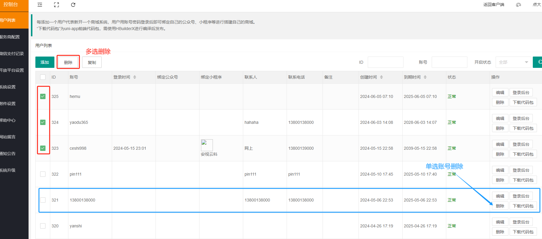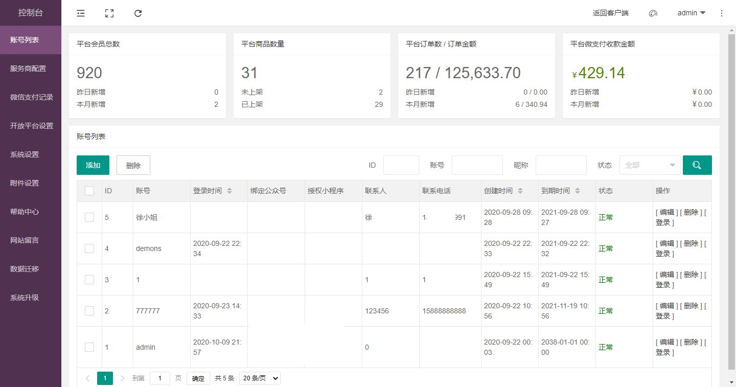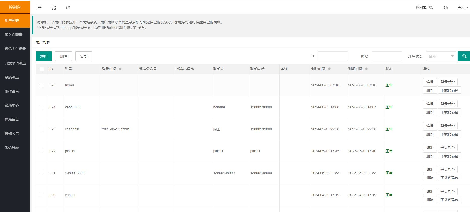 每添加一个用户代表新开一个商城系统,用户用账号密码登录后即可绑定自己的公众号、小程序等进行搭建自己的商城。