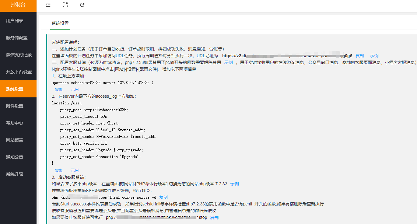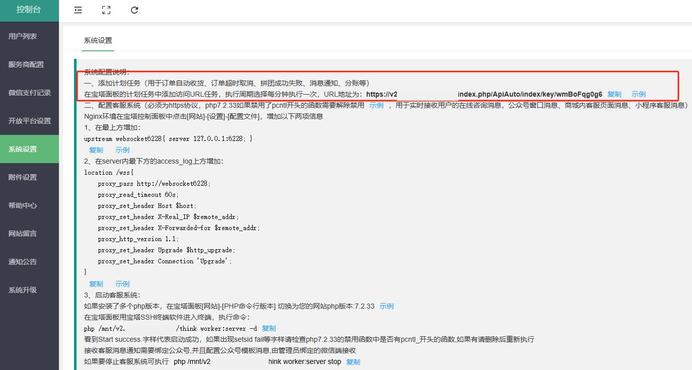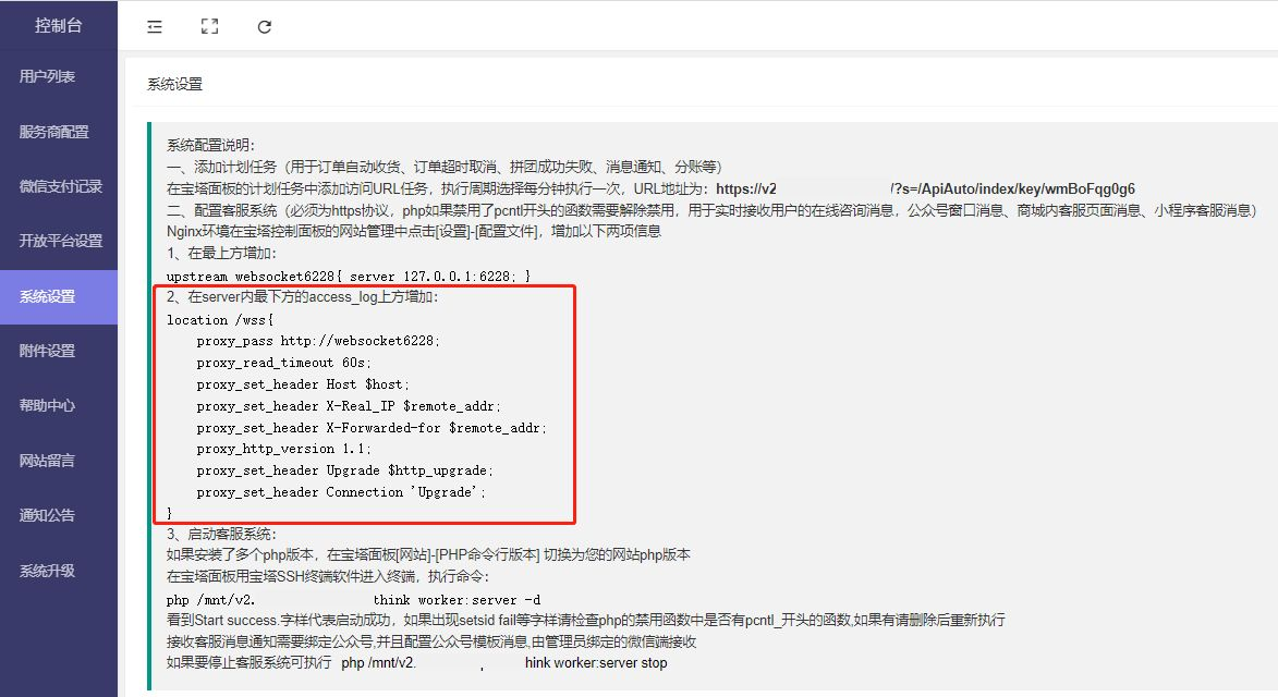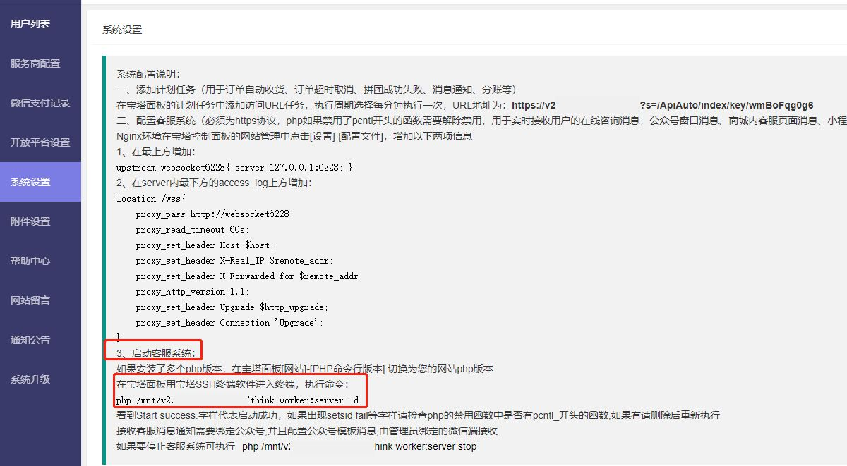 注意:设置完成后,如果使用系统客服,需要去宝塔进行配置