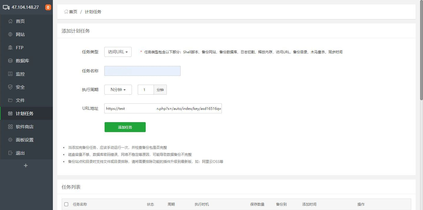 在宝塔面板的计划任务中添加访问URL任务,执行周期选择每分钟执行一次