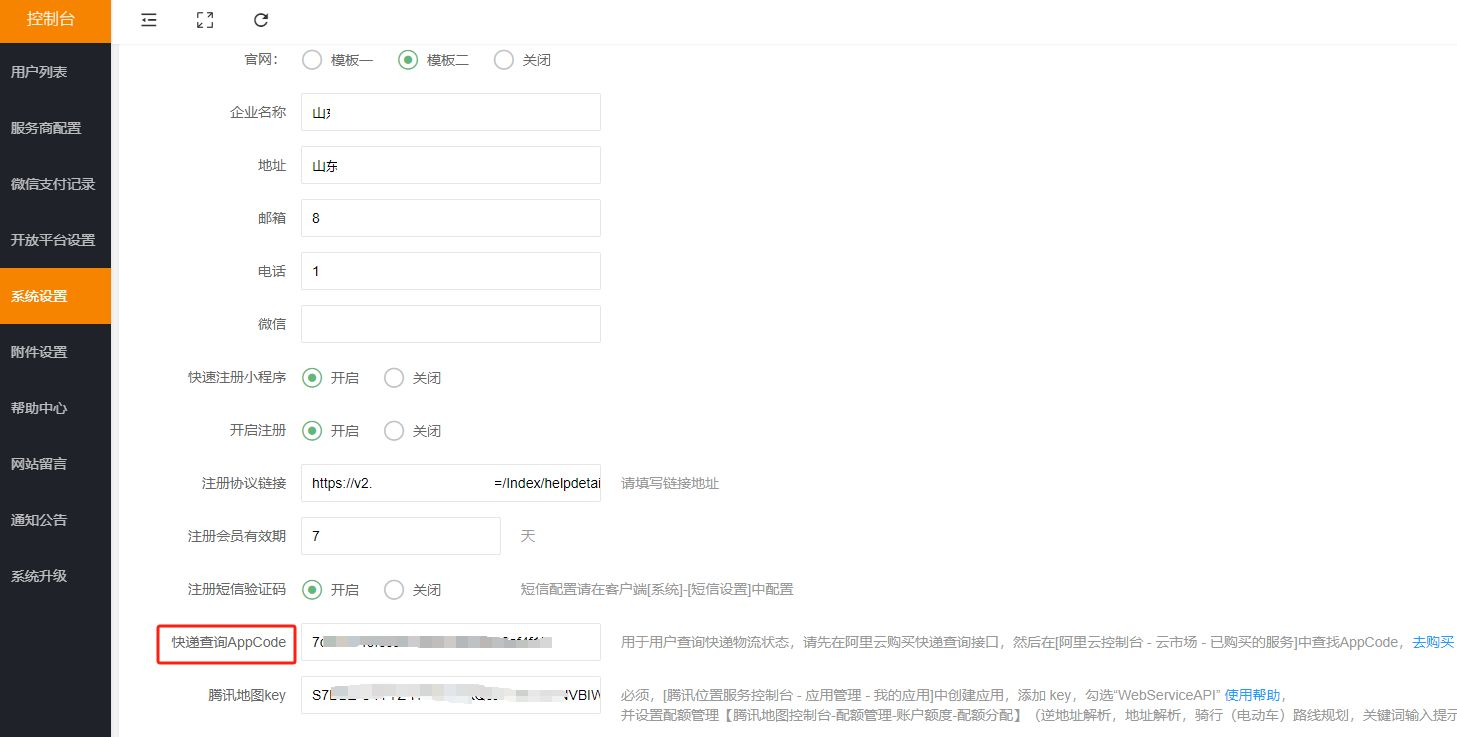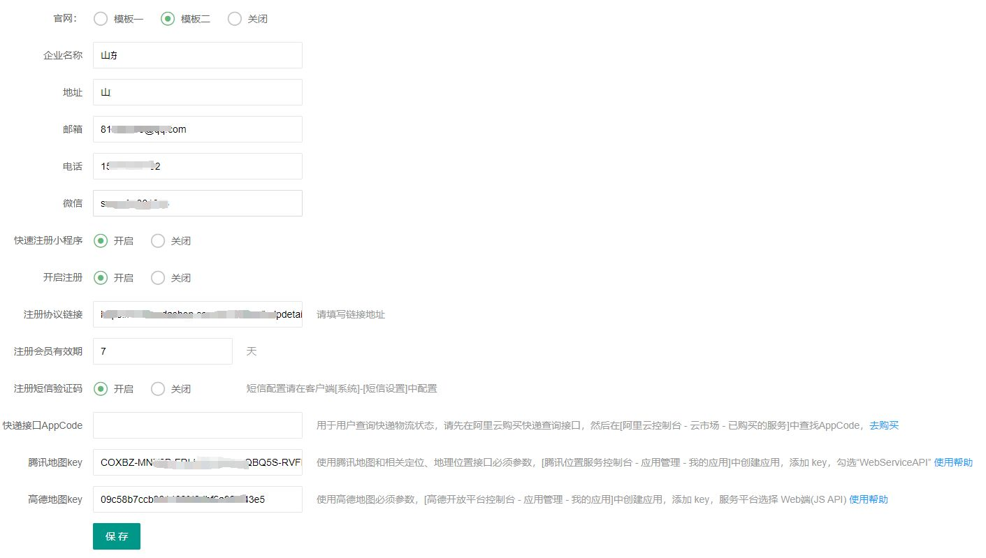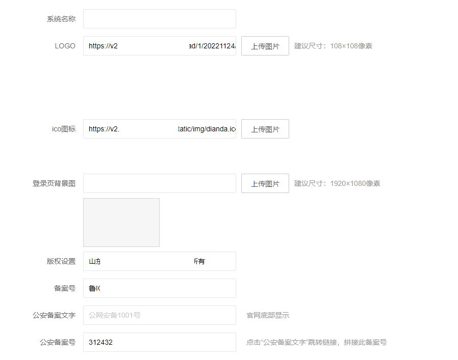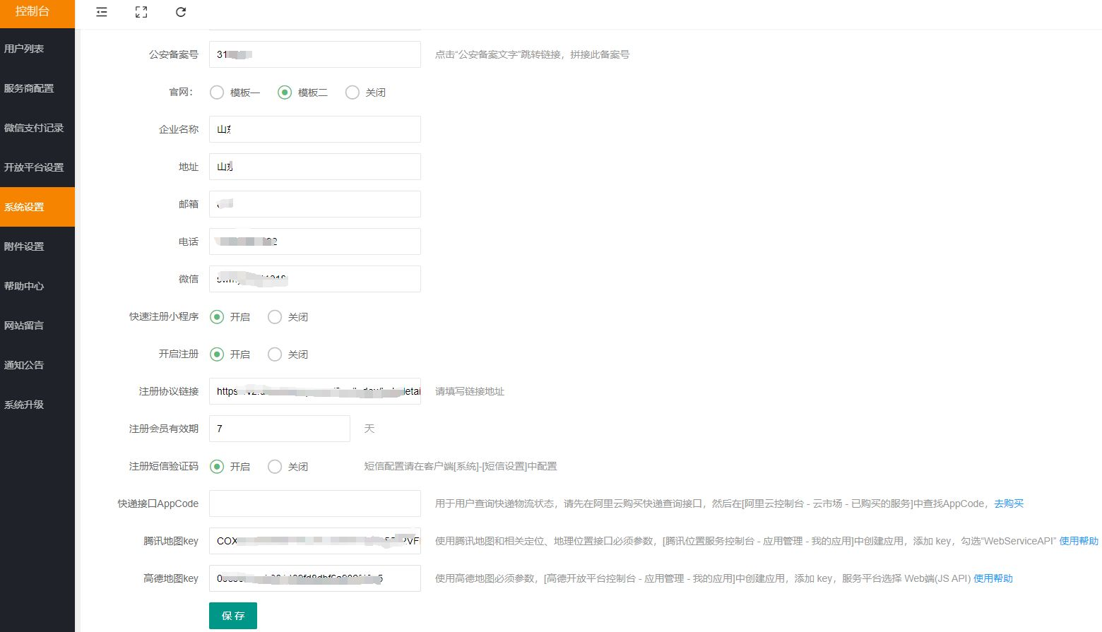 系统名称、logo、登录页背景图、版权设置、备案号、官网、企业信息、快速注册小程序开启关闭、注册协议链接、快递接口AppCode、腾讯地图key、高德地图key