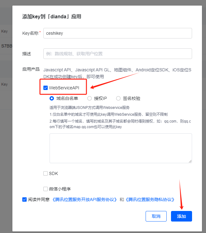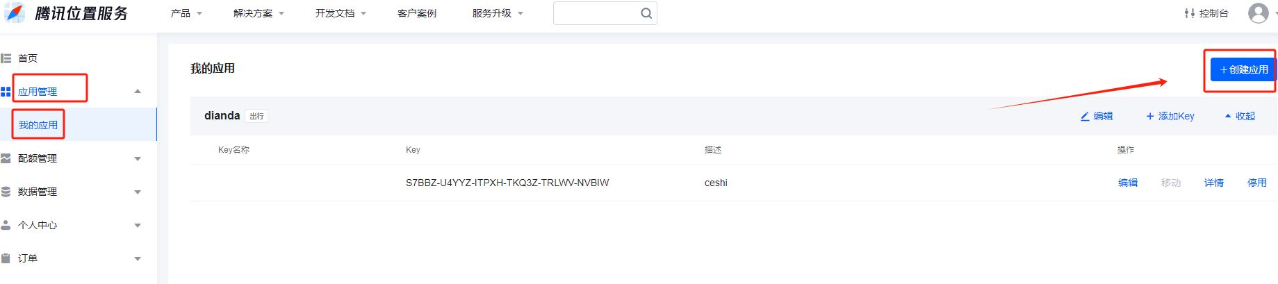 腾讯地图key: 使用腾讯地图和相关定位、地理位置接口必须参数,[腾讯位置服务控制台 - 应用管理 - 我的应用]中创建应用,添加 key,勾选“WebServiceAPI”使用帮助