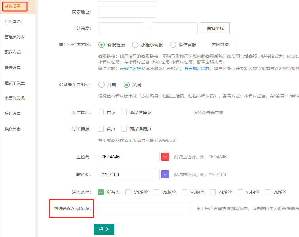1、选择跟随系统则跟随瑞速后台--控制台--系统设置里的快递查询AppCode