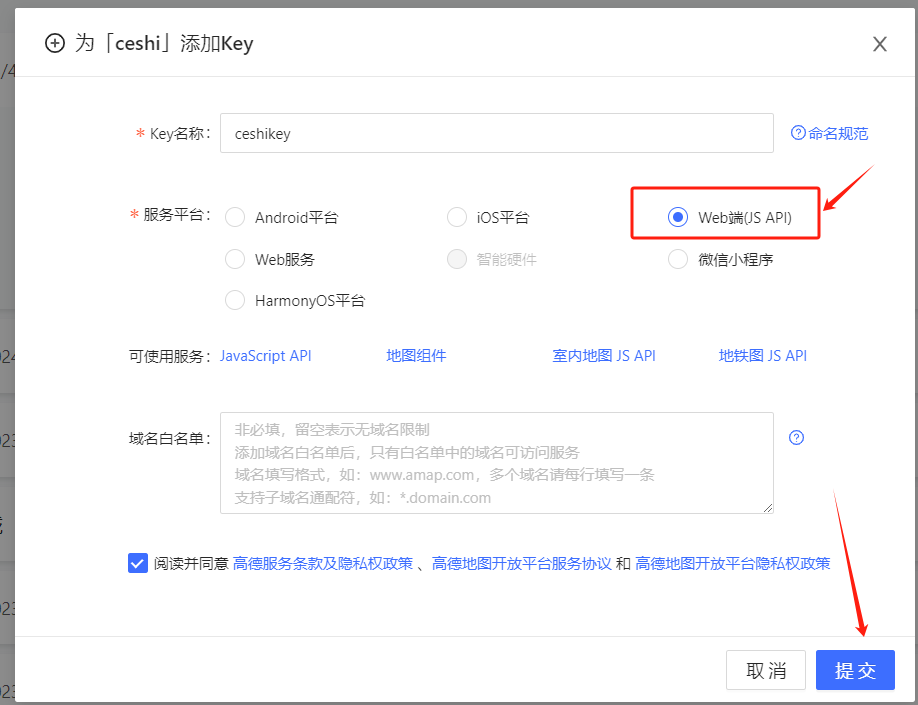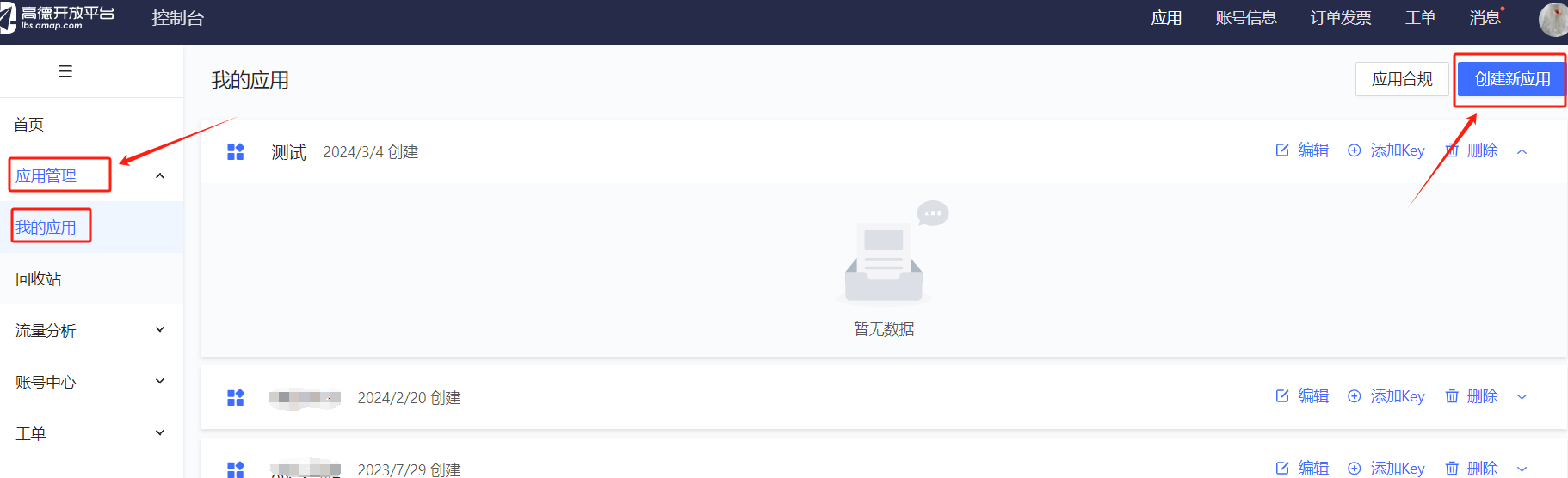 高德地图key: 使用高德地图必须参数,[高德开放平台控制台 - 应用管理 - 我的应用]中创建应用,添加 key,服务平台选择 Web端(JS API)使用帮助