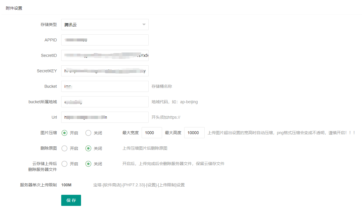 4、设置图片云存储,存储类型支持本地存储、阿里云、七牛云、腾讯云,图片压缩,删除原图、云存储上传后删除服务器文件,服务器单次上传限制