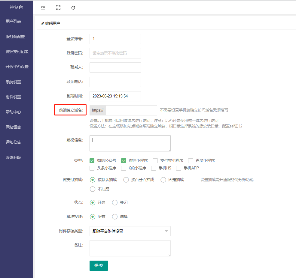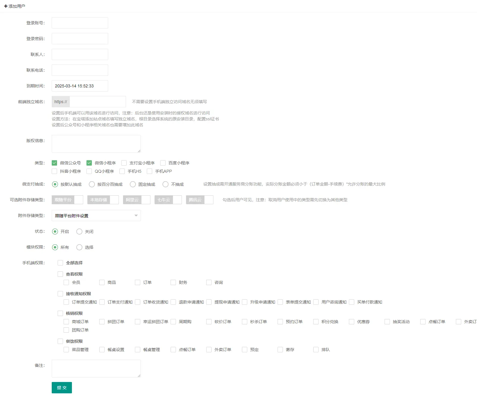 设置登录账号、密码、联系人、联系电话、到期时间、前端独立域名、版权信息、类型(公众号、小程序等)、微支付抽成、可选附件存储类型(勾选后用户可见,注意:取消用户使用中的类型需先切换为其他类型)、附件存储类型、状态、模块权限、手机端权限、备注信息等