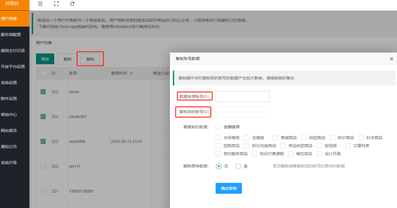 输入数据来源账号id、复制到的账号id、要复制的数据(包括会员等级、优惠券、商城商品拼团、砍价、秒杀、团购、积分兑换、幸运拼团、短视频、文章列表、预约服务、知识付费、餐饮菜品、设计页面等)