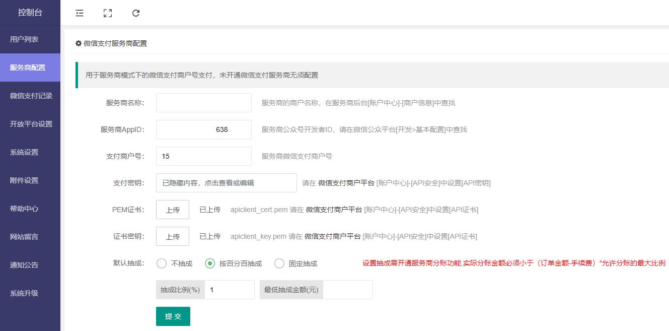 服务商名称,服务商AppID,支付商户号,支付密钥,PEM证书,证书密钥,默认抽成(不抽成,按百分百抽成,固定抽成)