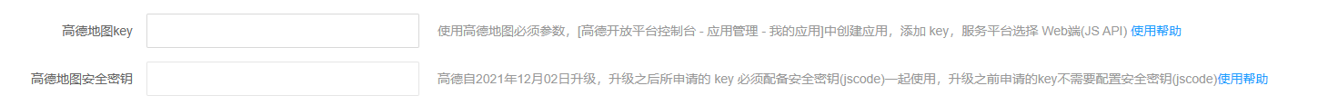 高德地图key: 使用高德地图必须参数,[高德开放平台控制台 - 应用管理 - 我的应用]中创建应用,添加 key,服务平台选择 Web端(JS API)使用帮助