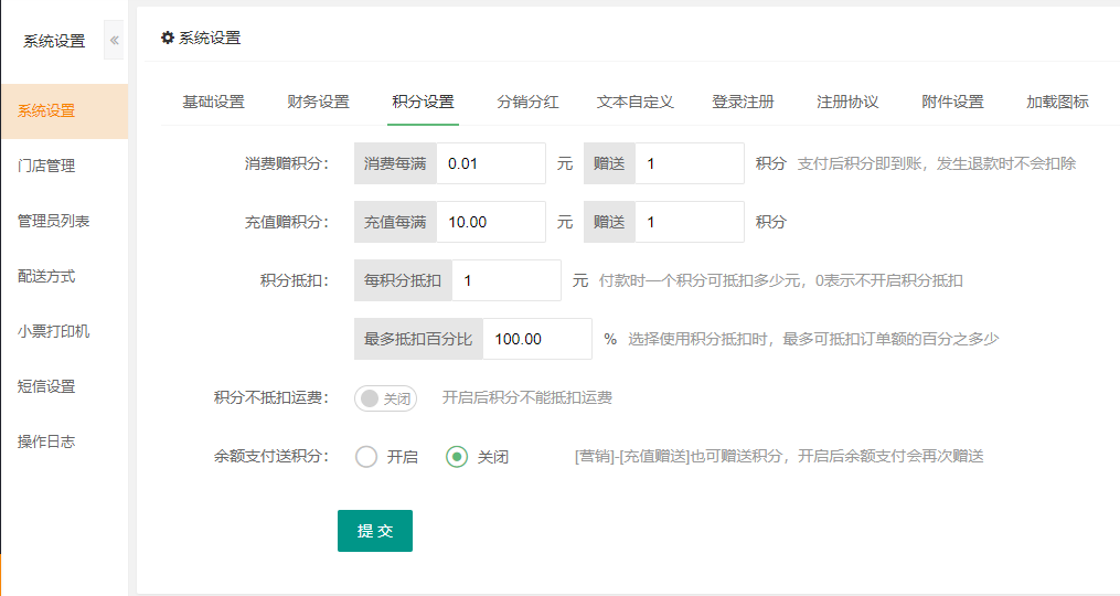 可以设置余额支付送积分([营销]-[充值赠送]也可赠送积分,开启后余额支付会再次赠送)