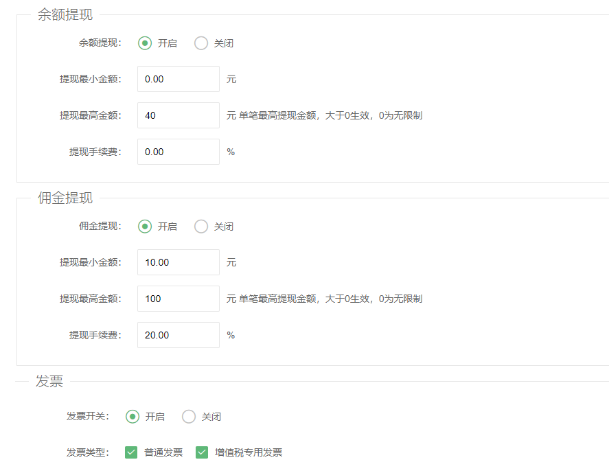 设置佣金提现开启,设置佣金提现最小金额,最大提现金额,提现手续费。