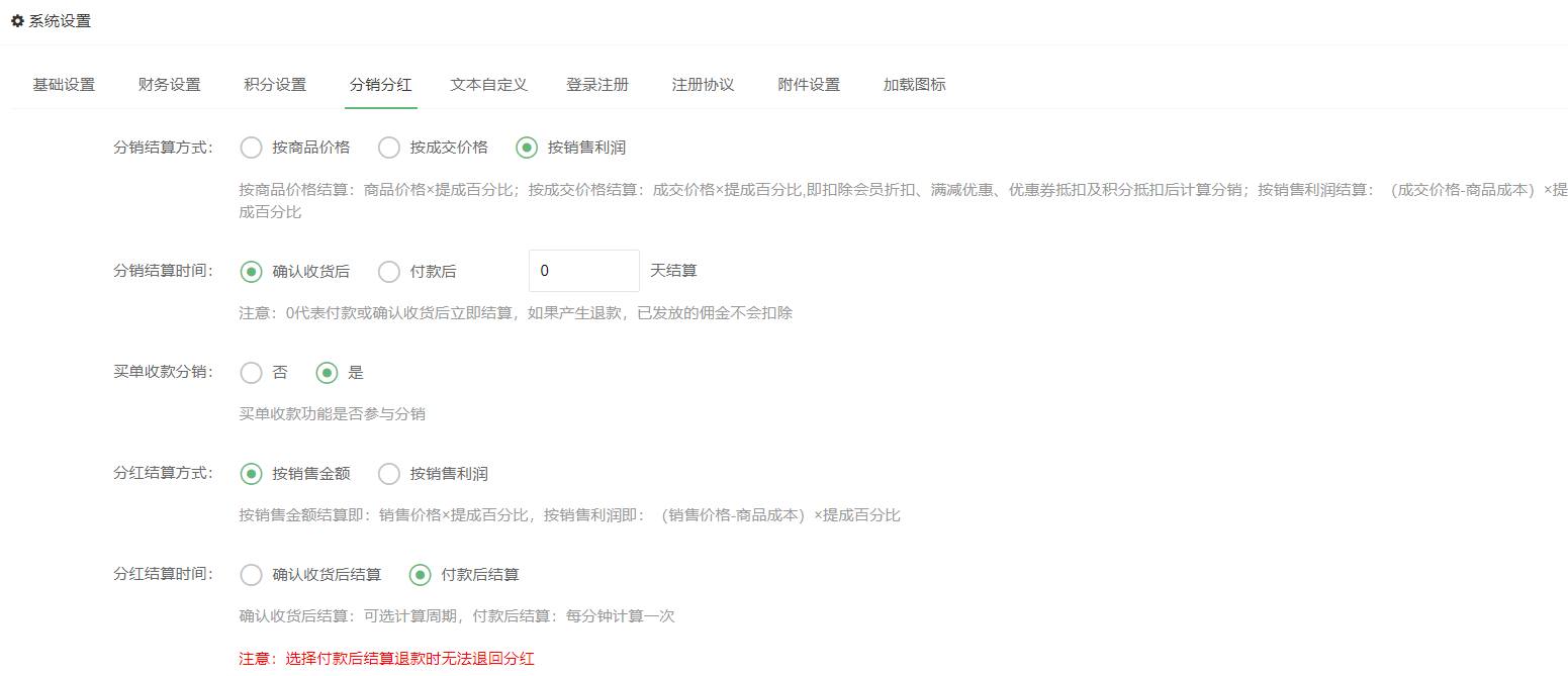 分销结算时间,确认收货或付款后结算,注意:选择付款后结算,如果产生退款,已发放的佣金不会扣除。