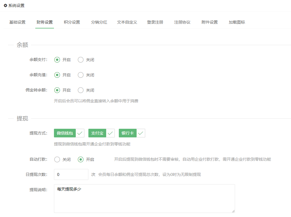 日提现次数:会员每日余额和佣金可提现总次数,设为0时为无限制提现