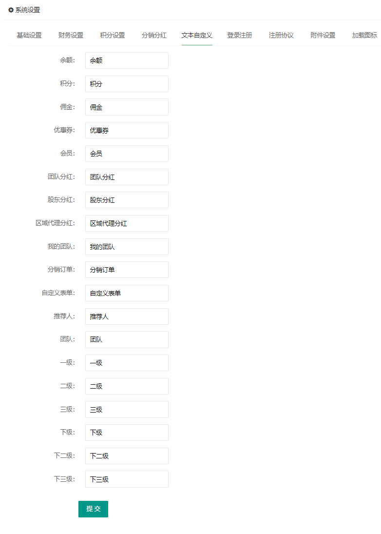 自定义余额,积分,佣金,优惠券,会员、团队分红、股东分红、区域代理分红、我的团队、分销订单、自定义表单、推荐人、团队、一级、二级、三级、下级、下二级、下三级等名称。