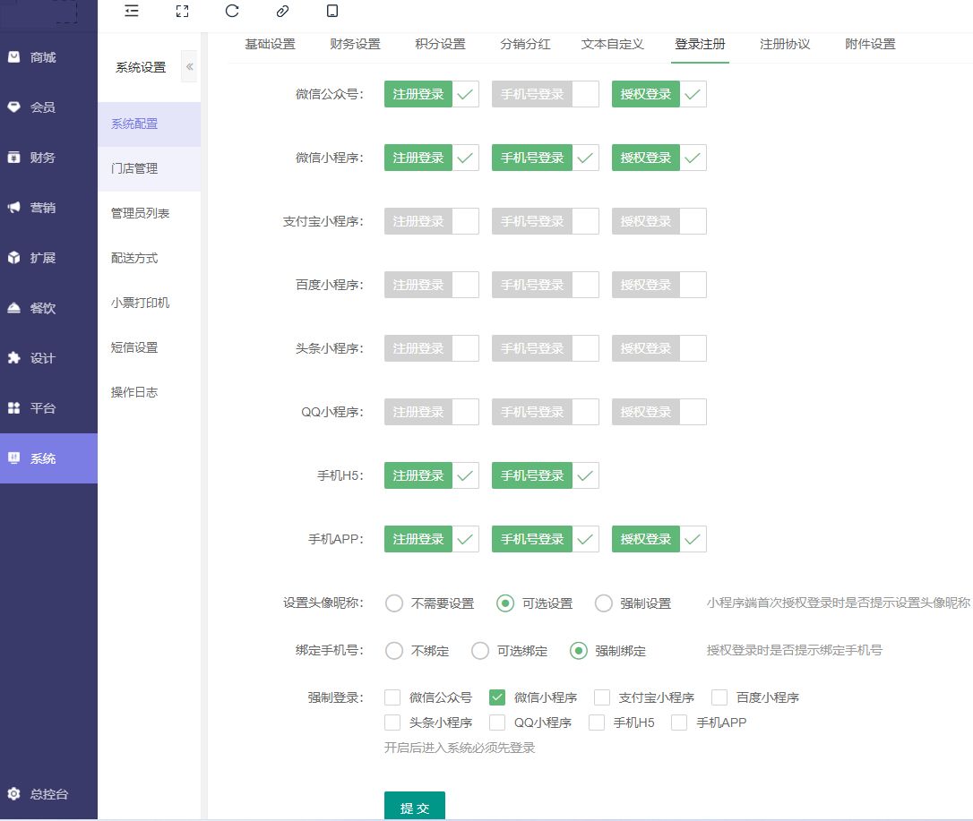 设置微信公众号,微信小程序,支付宝小程序,百度小程序,头条小程序,手机H5,手机APP登录方式的设置,可以选择注册登录,手机号登录,授权等方式,设置头像昵称(小程序端首次授权登录时是否提示设置头像昵称),绑定手机号(授权登录时是否提示绑定手机号)、强制登录(开启后进入系统必须先登录,此设置有商家驳回风险)