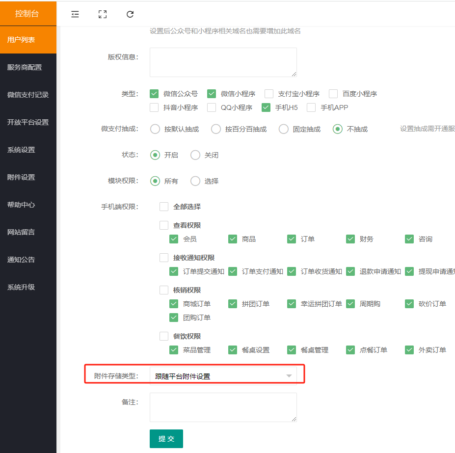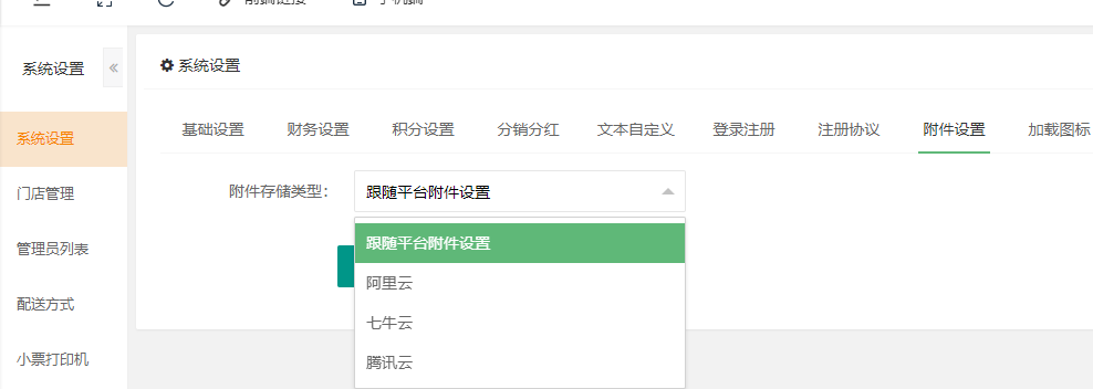 用于给子账号单独设置附件存储类型,支持阿里云、七牛云、腾讯云或跟随平台附件设置