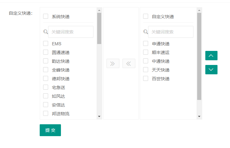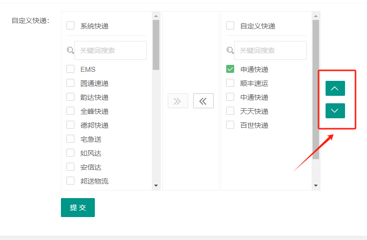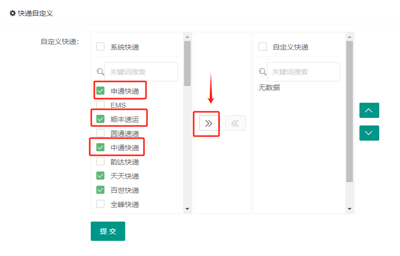在系统快递里选择需要展示的快递,点击右箭头,点击保存按钮,即可自定义展示所需快递