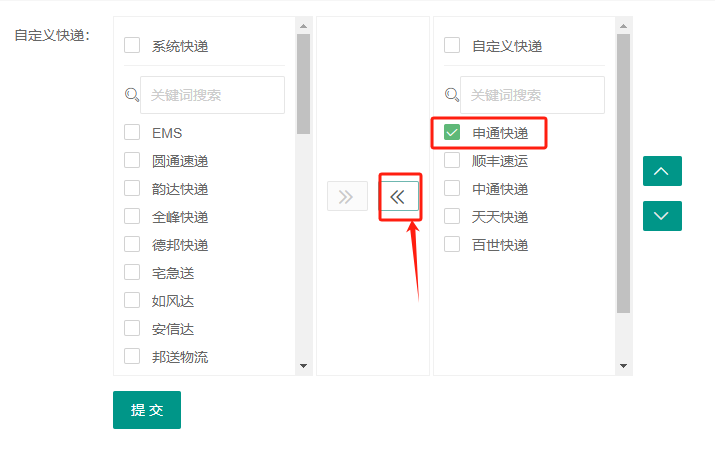 自定义快递中选择申通快递,点击左箭头,点击保存按钮