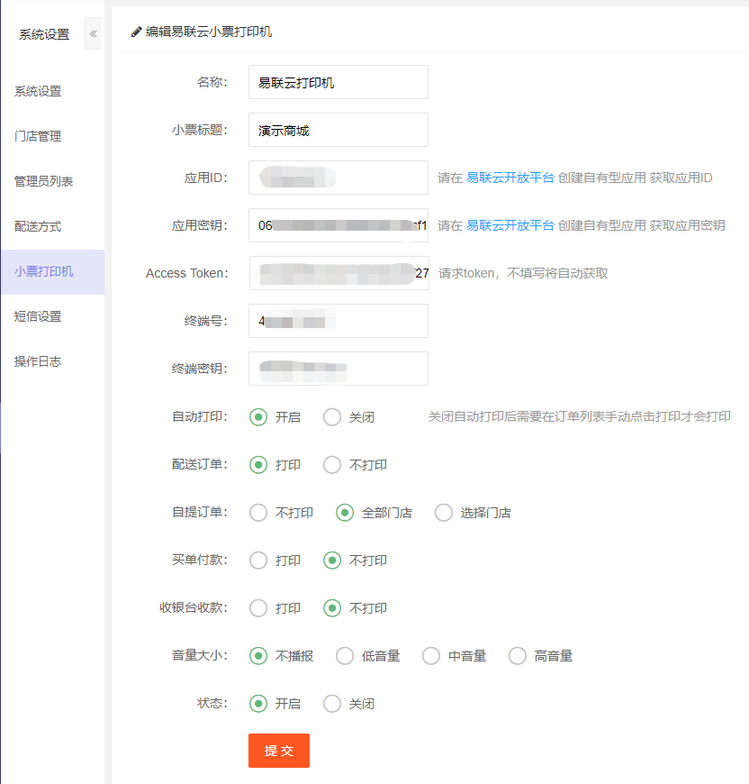 注意:易联云小票打印机需要在易联云创建自有型应用(易联云建议K4、K8;飞鹅都可以)