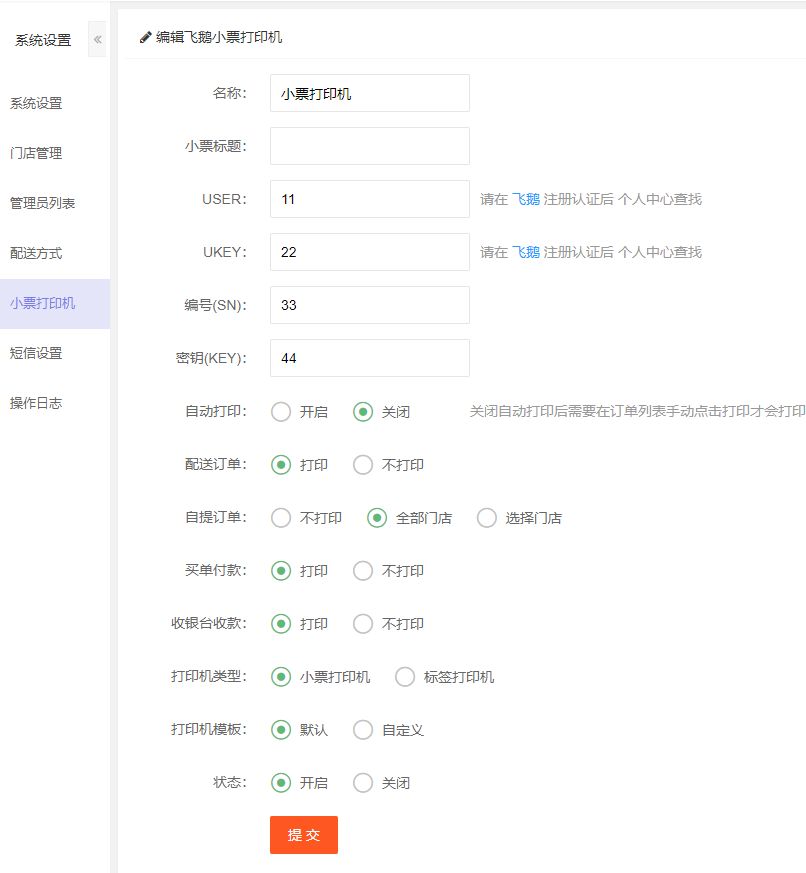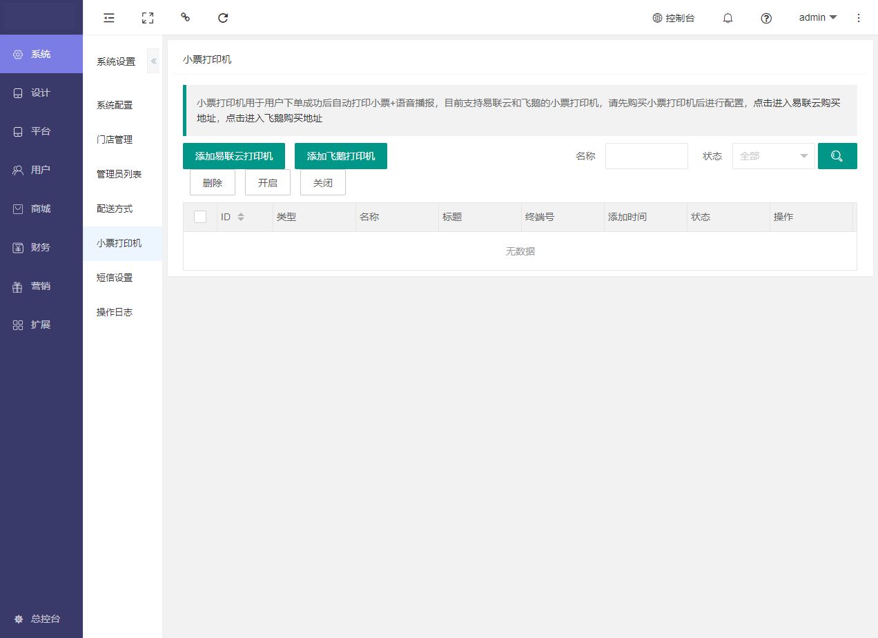 小票打印机用于用户下单成功后自动打印小票+语音播报,目前支持易联云和飞鹅的小票打印机,请先购买小票打印机后进行配置,点击进入易联云购买地址,点击进入飞鹅购买地址,点击进入飞鹅标签打印机购买地