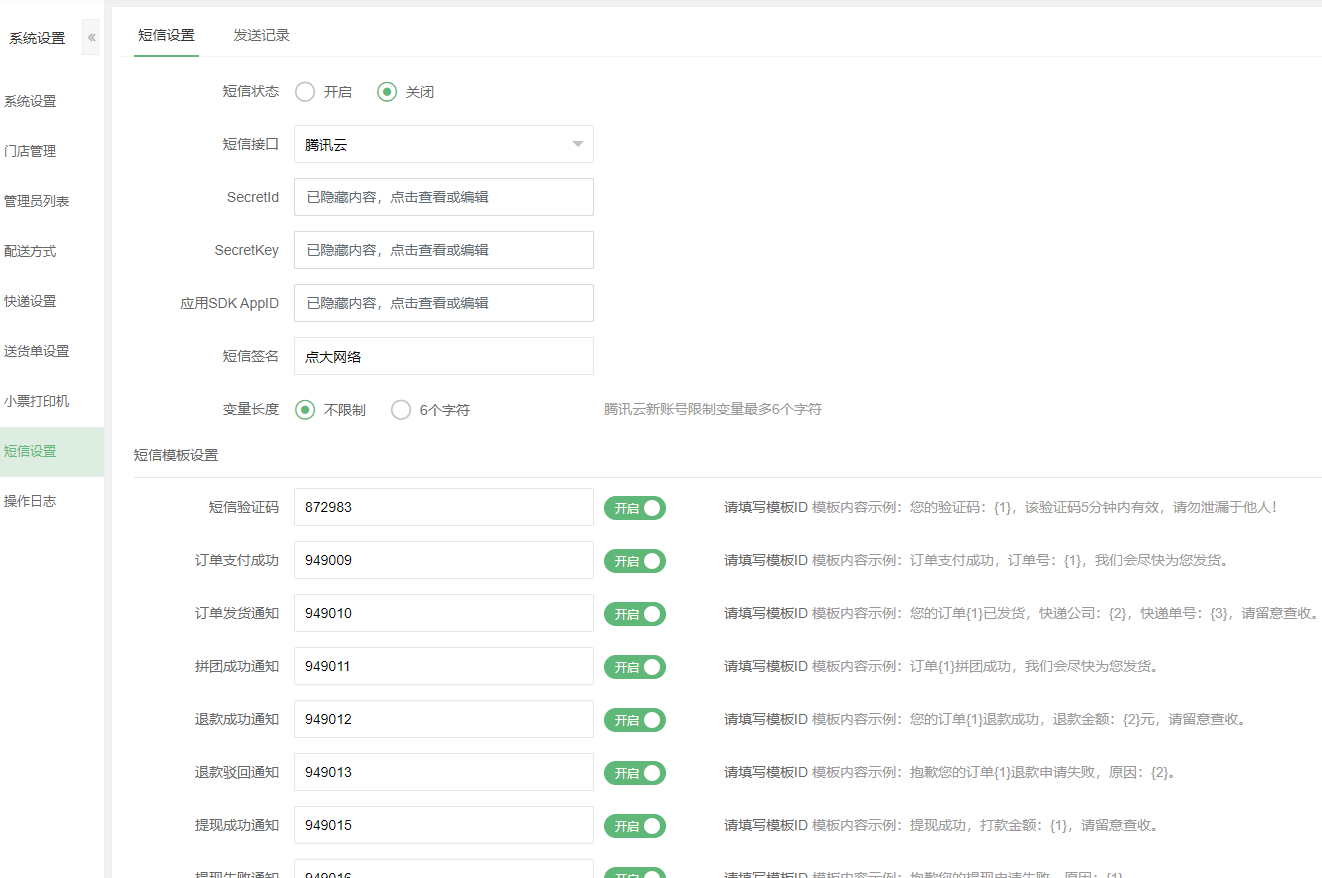 然后将AccessKey ID、AccessKey Secret、短信签名、模板CODE配置到短信设置中,选择对应的变量长度