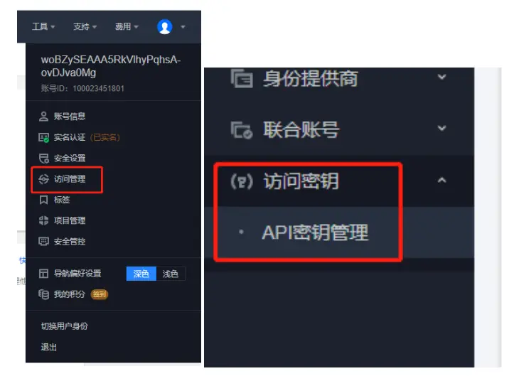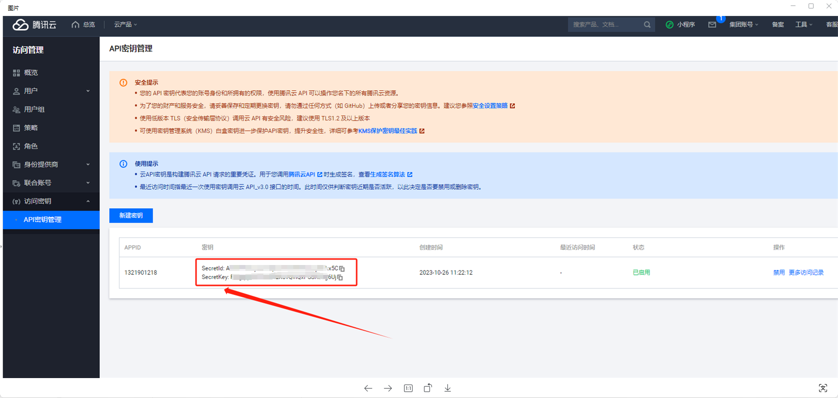 4、审核通过后,把短信签名,正文模板编号填写到后台,点击右上角的头像---访问管理---API密钥管理,获取AccessKey ID、AccessKey Secret