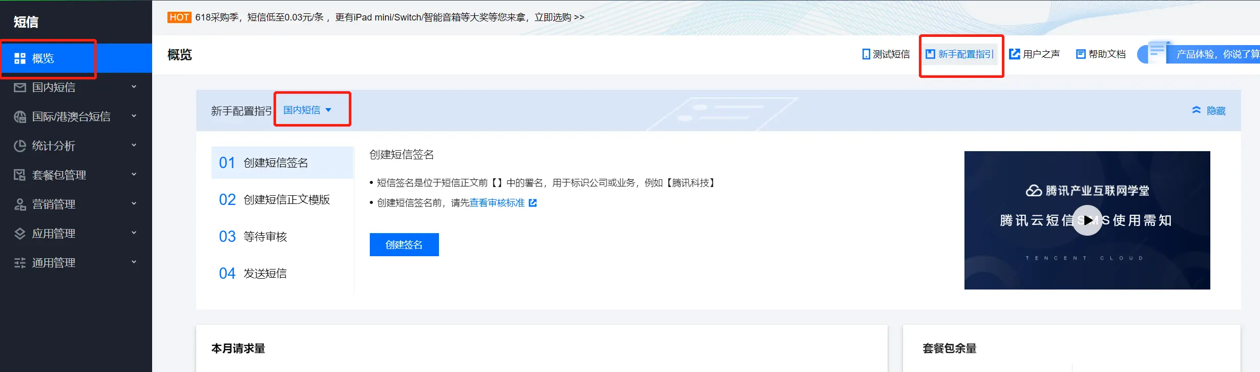 2、开通后,进入短信控制台,可跟随概览页>新手配置指引配置申请短信签名、模板并发送短信。