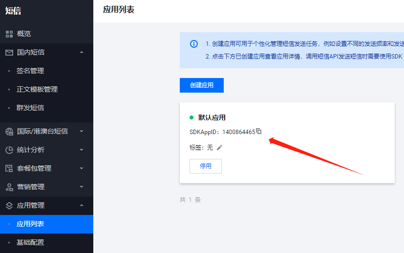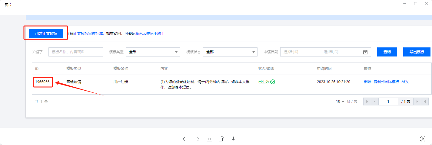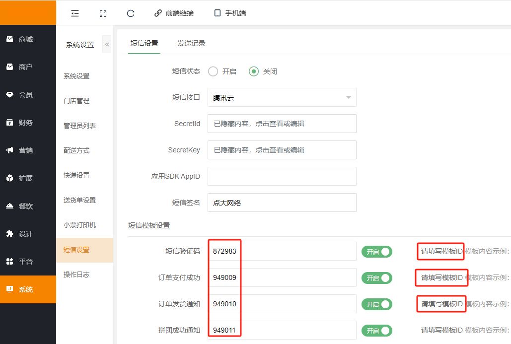 注意:短信模板设置里填写的是模板id,不是模板内容示例,短信模板按照后台的模板内容示例申请