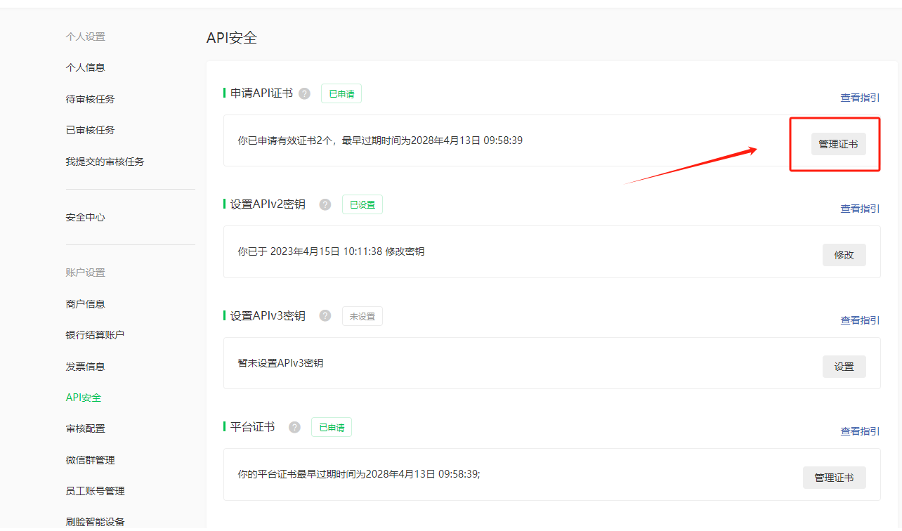 V3支付密钥:微信支付商户平台-[账户中心]-[API安全]中设置[APIv3密钥]