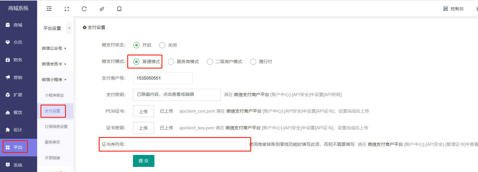 证书序列号配置:平台—微信小程序/微信公众号—支付设置—普通模式—配置证书序列号