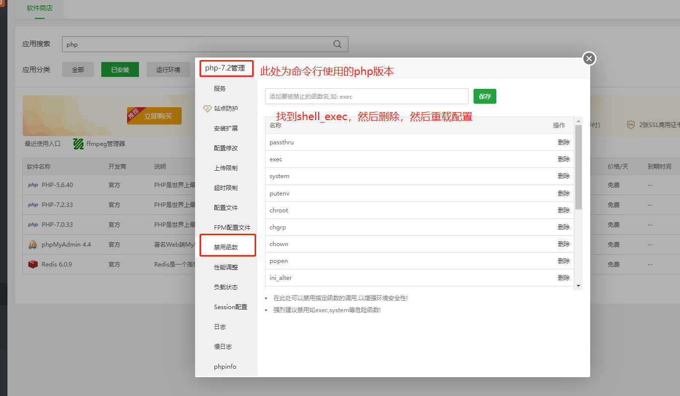 第二步:宝塔--软件商店里搜索PHP,找到对应的命令行使用的PHP版本,选择“禁用函数”,找到shell_exec并删除