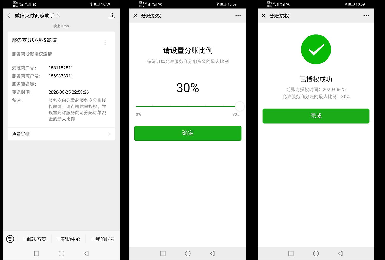 服务商分账,主要用于服务商帮助特约商户完成订单收单成功后的资金分配。本平台服务商分账主要用于对特约商户的微信支付收款进行抽成;首先在服务商微信支付商户平台的【产品中心】-【特约商户授权产品】中开启服务商分账功能,然后进入服务商分账的特约商户列表中选择需要抽成的商户号,点击发起邀请进行发起,特约商户管理员收到邀请通知后设置分账最大比例即授权完成