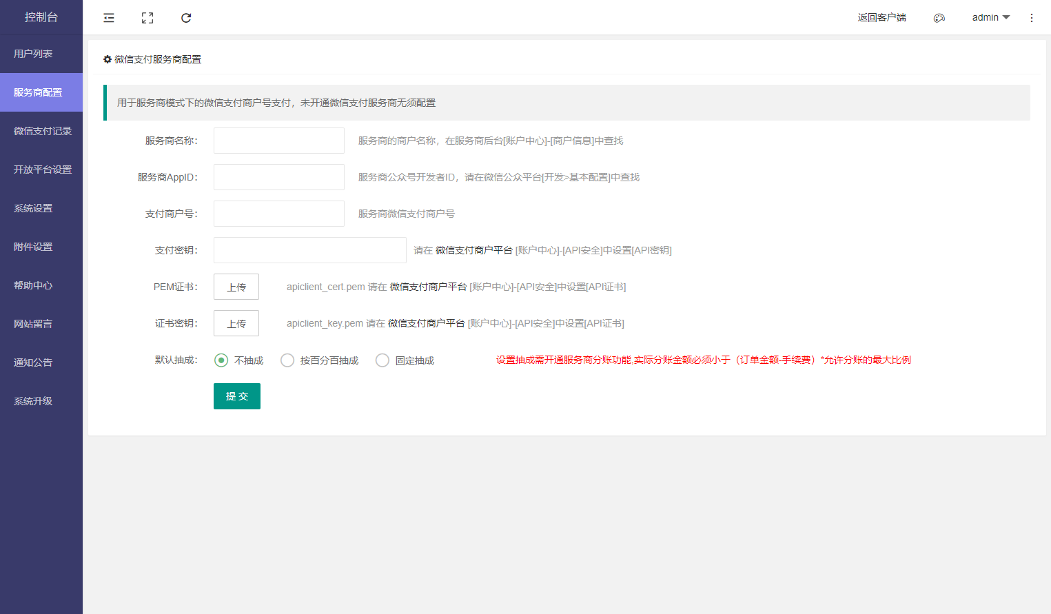 如果需要用服务商模式进行支付则需要先在【控制台】-【服务商配置】中设置服务商信息