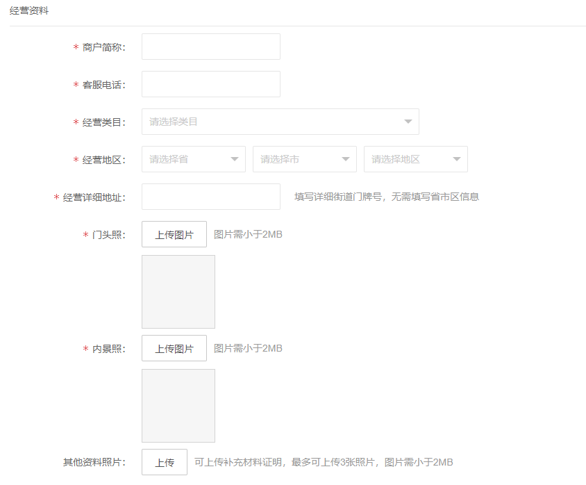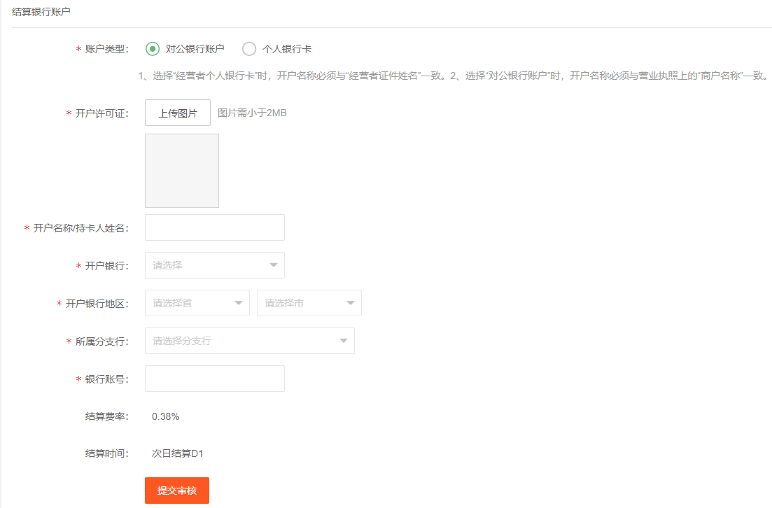 提交申请资料,主体类型可以选择个体户、企业、个人;提供营业执照信息、经营者/法人身份证、经营资料、结算银行账户