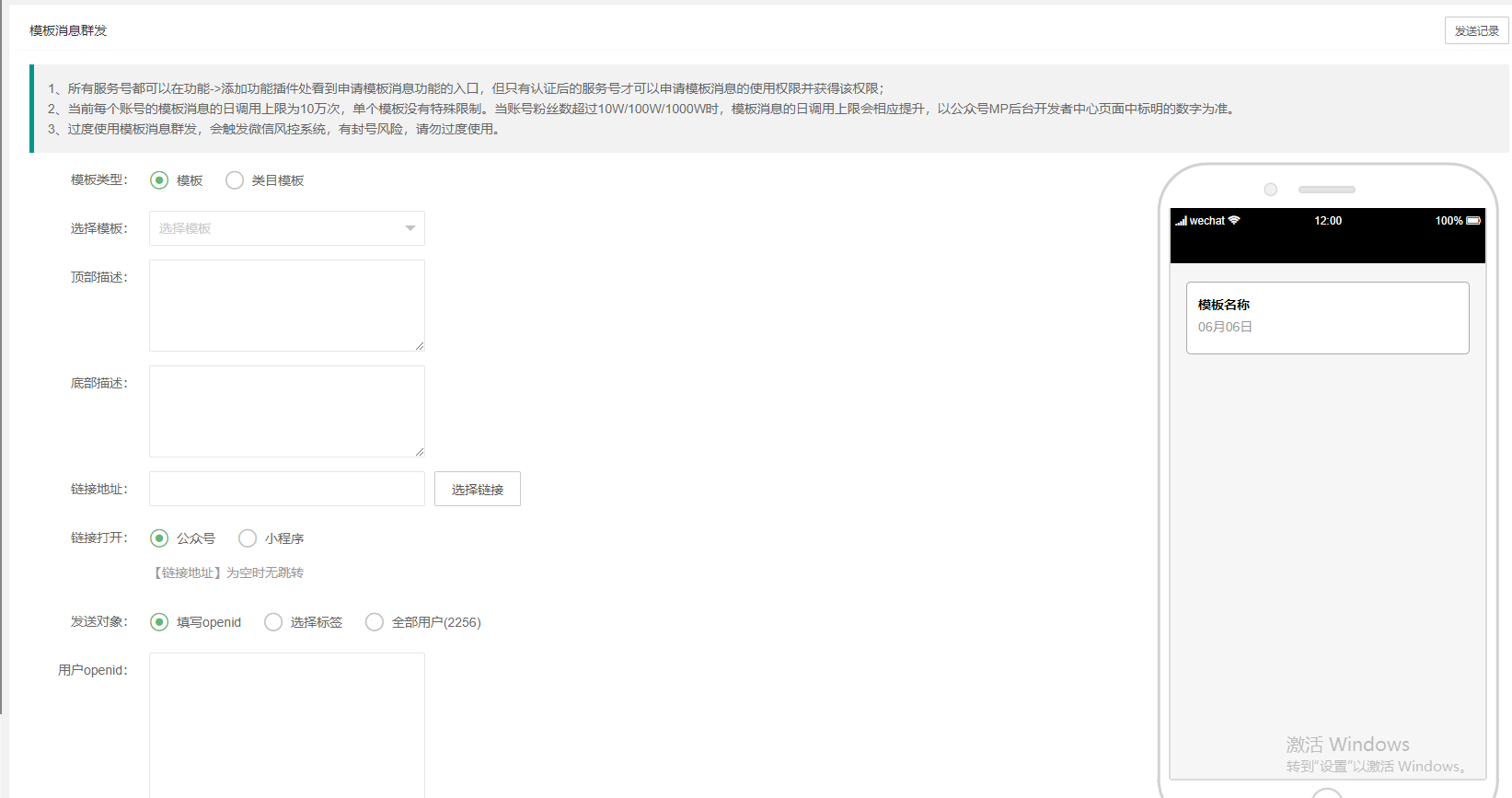 3、过度使用模板消息群发,会触发微信风控系统,有封号风险,请勿过度使用。