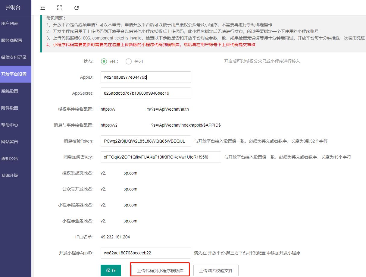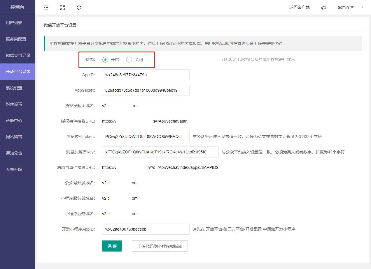 首先在控制台配置并开启开放平台配置,配置流程参考【开放平台设置】章节