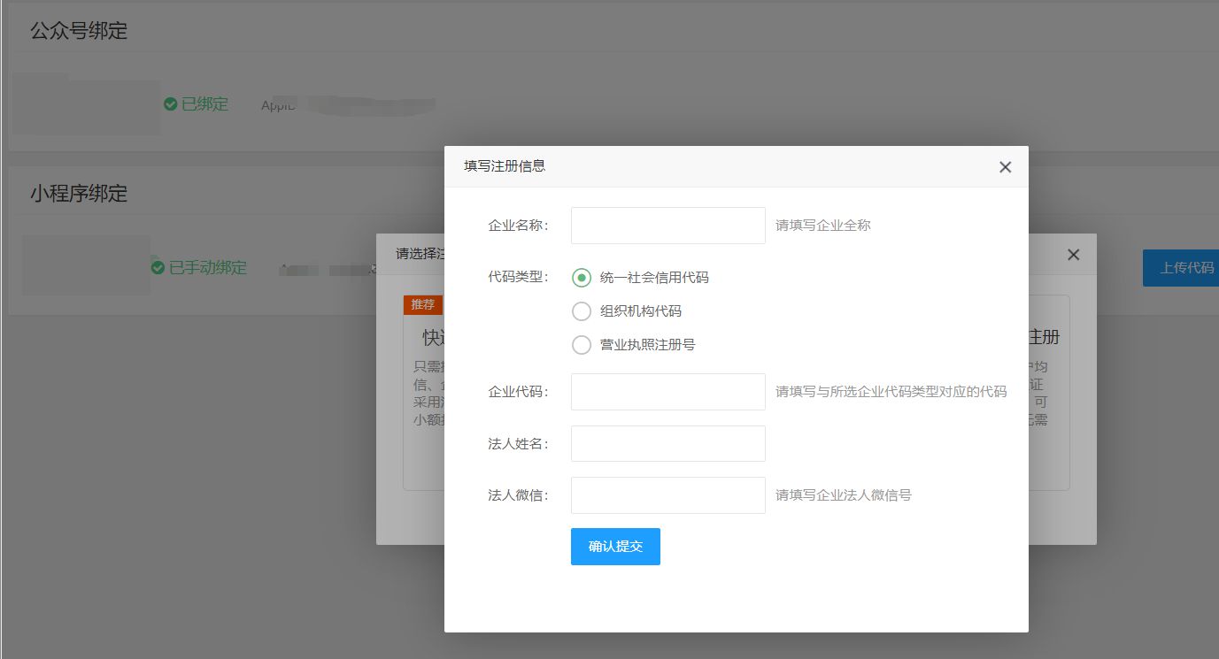 方式二:如果已注册公众号可以在后台---平台---微信小程序---小程序绑定---点击创建---选择“复用公众号资质注册”