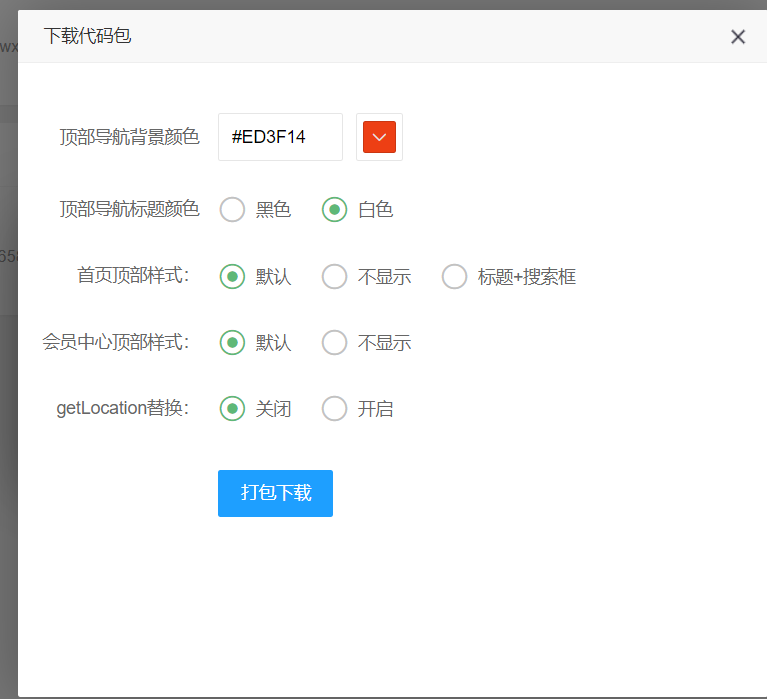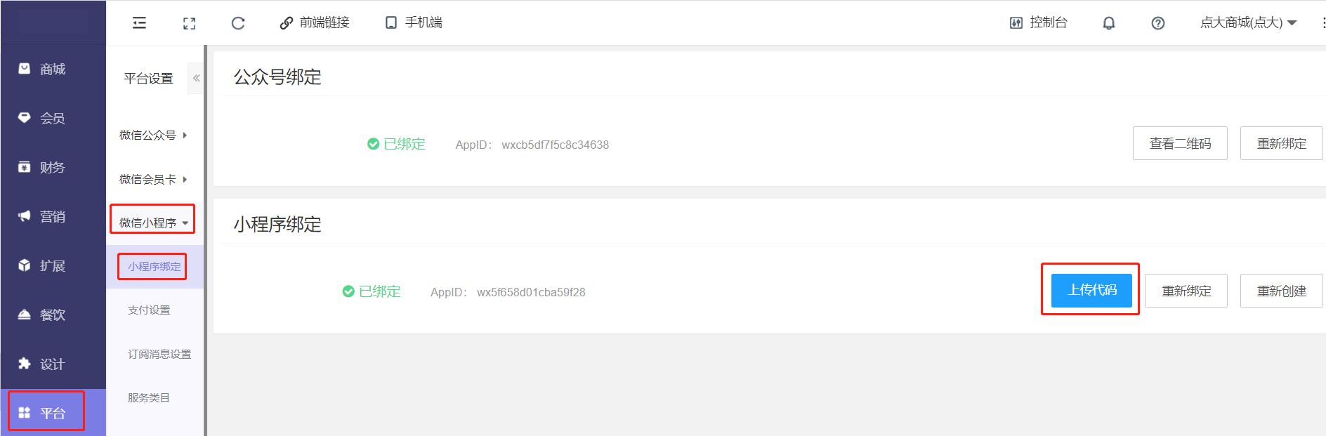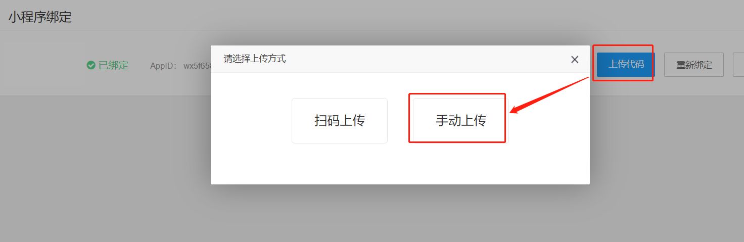 1、后台---平台---微信小程序---小程序绑定---点击"上传代码"---选择“手动上传”---下载代码包---选择颜色、样式---点击“打包下载”,把代码包下载到电脑上并进行解压。下载小程序代码后需要用微信开发者工具进行上传,然后自己登录小程序后台,在版本---管理---开发版本进行提交审核