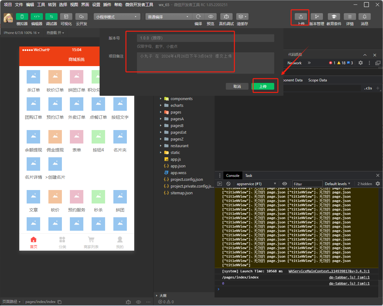 4、小程序加载好之后点击上传按钮,完善版本号和项目备注,把代码上传到小程序后台