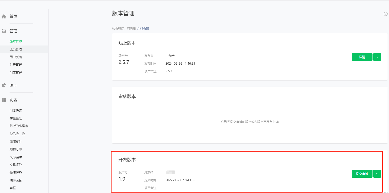 在版本管理中选择一个开发版本进行提交审核,小程序提交审核前需要完善小程序隐私保护设置和订单中心path,具体可参考操作手册微信小程序隐私保护设置和订单中心path