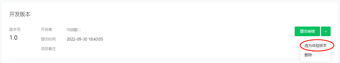 7、在版本管理中选择一个开发版本进行提交审核,小程序提交审核前需要完善小程序隐私保护设置和订单中心path,具体可参考操作手册微信小程序隐私保护设置和订单中心path