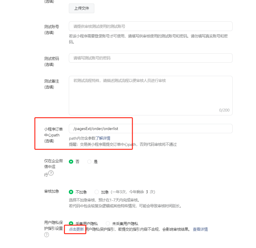 小程序提交审核前需要完善小程序隐私保护设置和订单中心path,具体可参考操作手册微信小程序隐私保护设置和订单中心path
