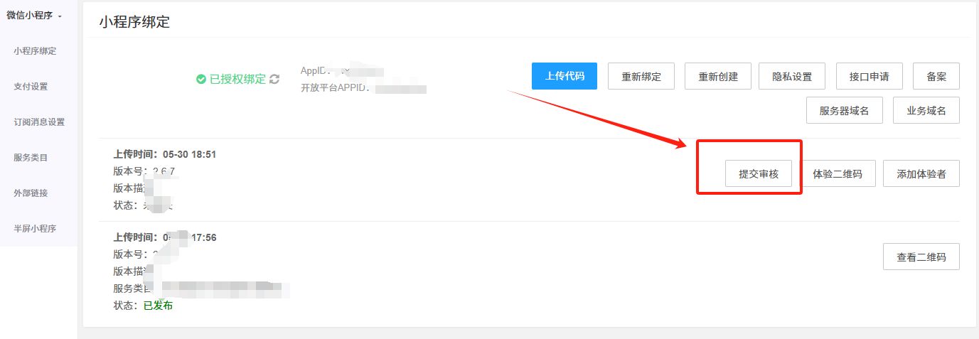 控制台-开放平台设置-上传代码到小程序模板库-开发小程序管理员扫码-上传成功后-在用户账号下上传代码-可直接在后台提交审核
