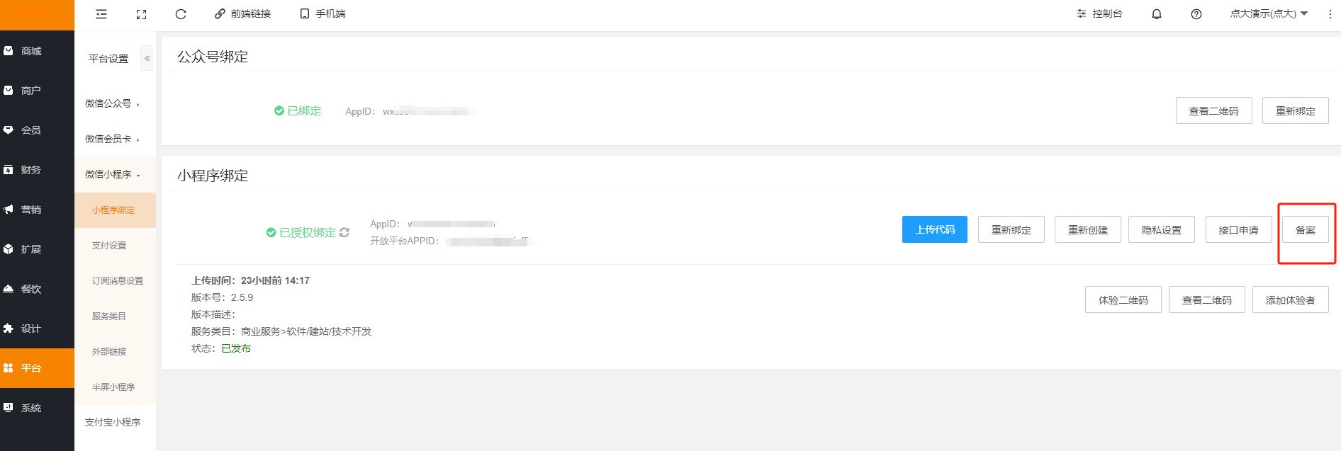 瑞速后台--微信小程序备案--仅授权绑定的小程序支持在瑞速后台进行小程序备案