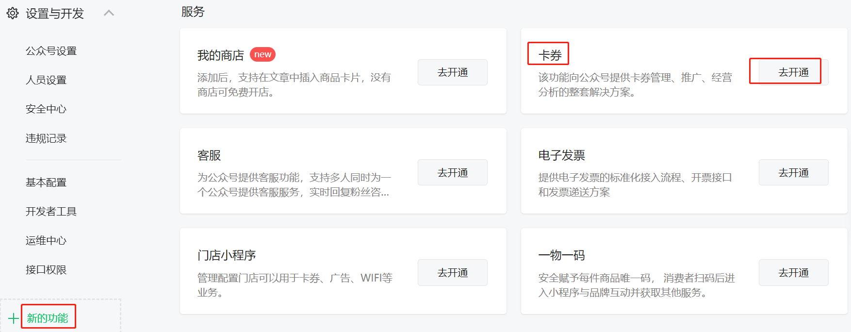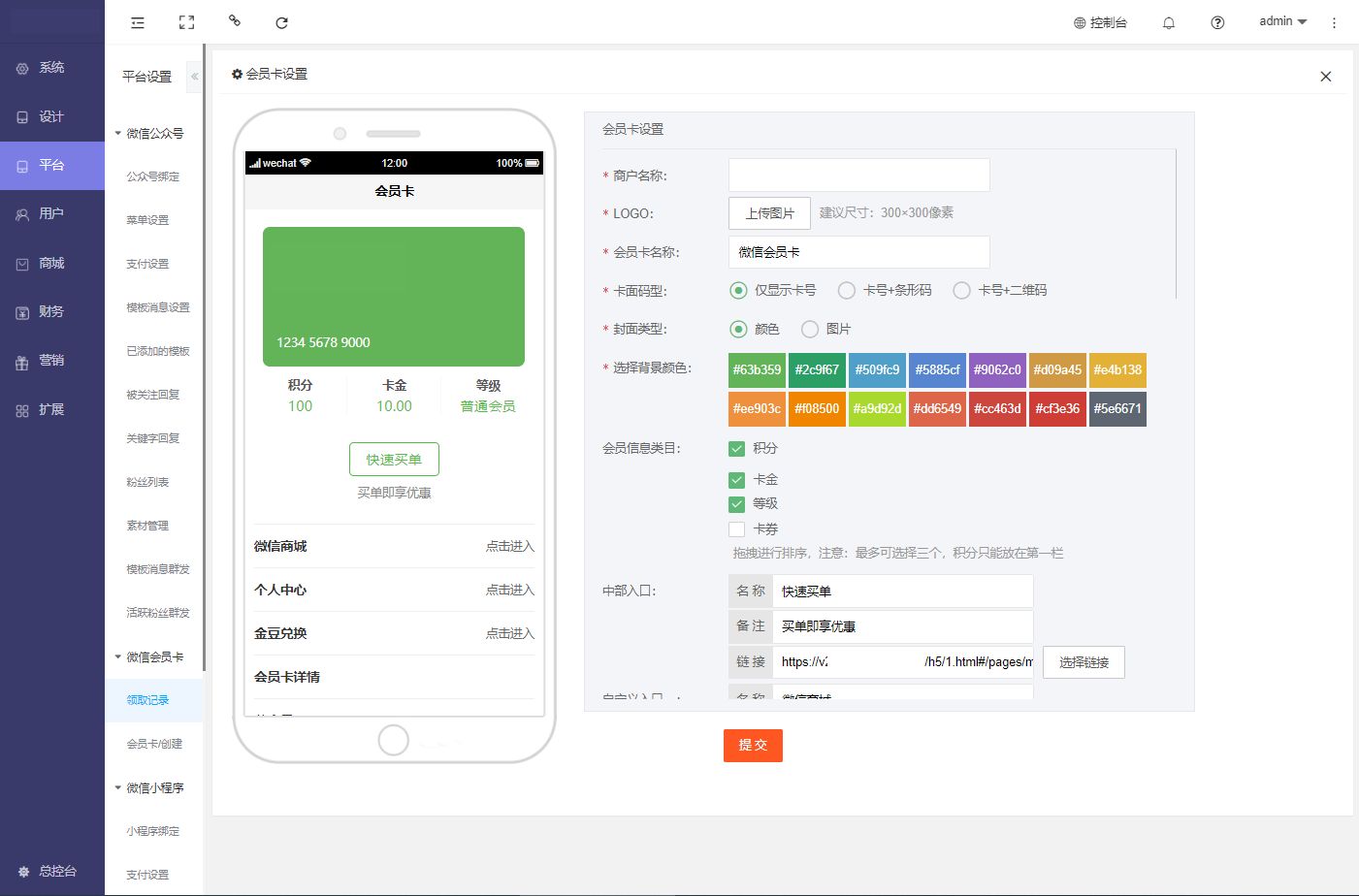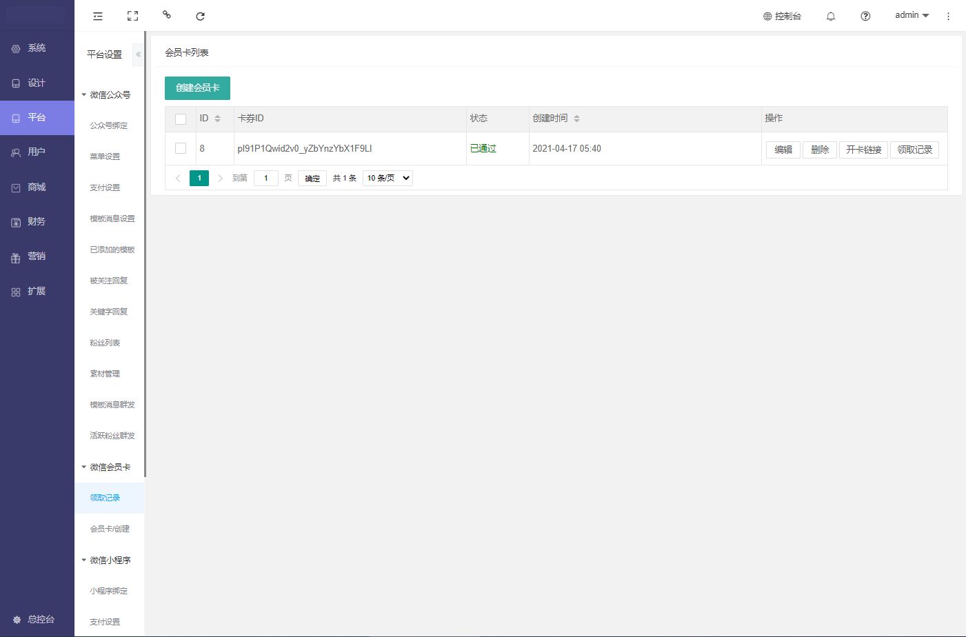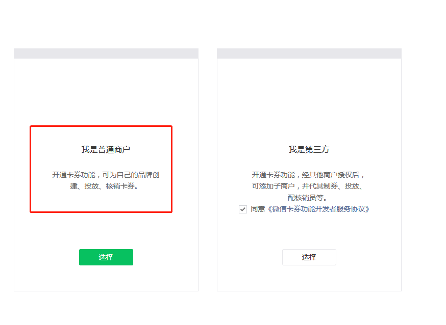 注:创建会员卡前需要申请服务号并在后台-平台-微信公众号里配置,并登录微信公众平台—公众号登录—功能—卡券,