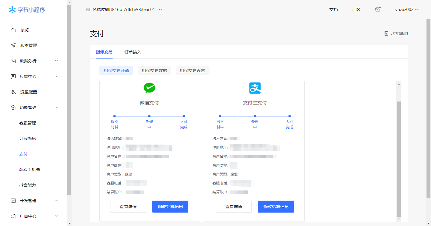 创建完成后进入小程序管理中心 功能管理-支付 中开通支付功能