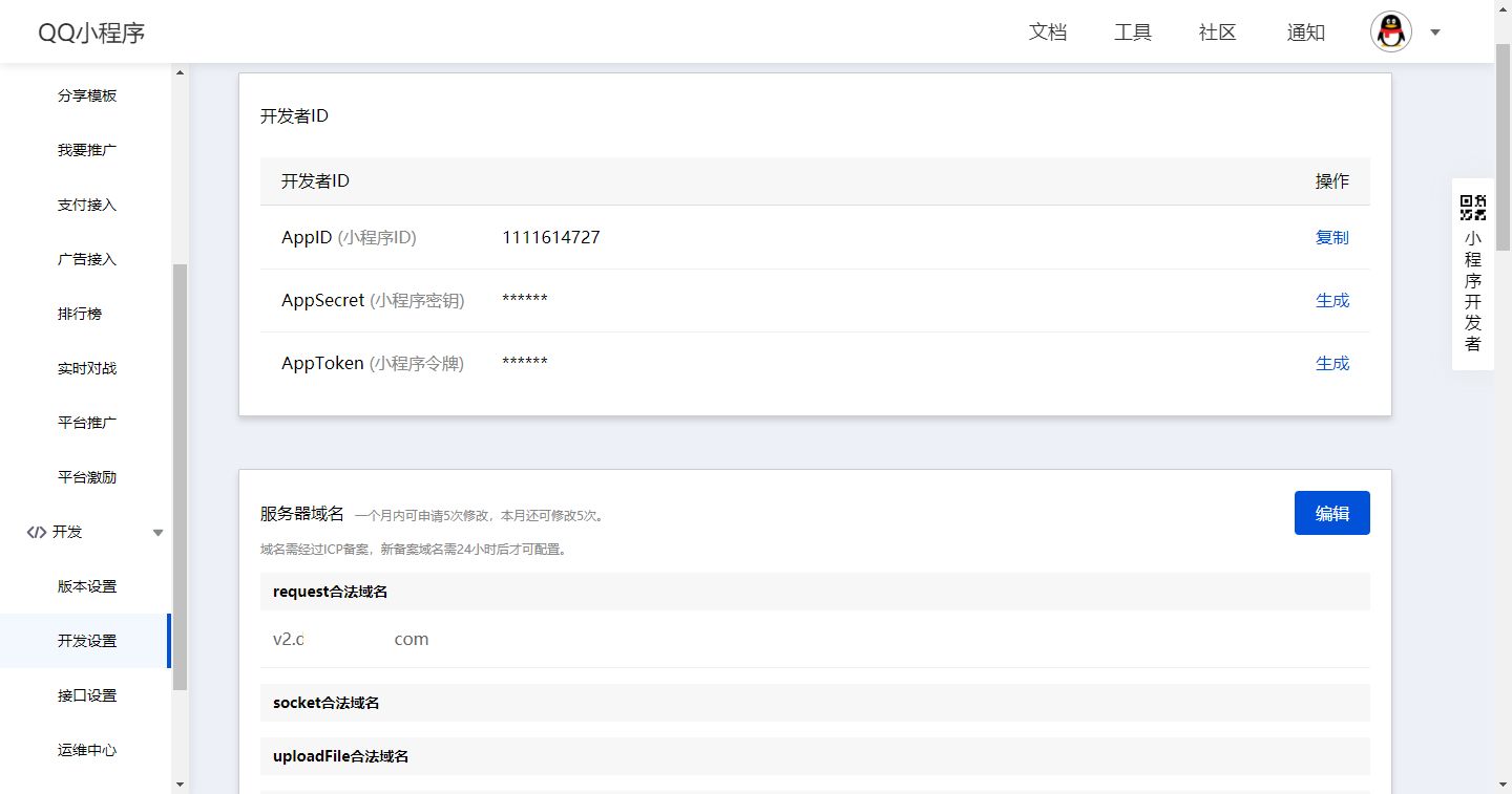 在开发-开发设置中填写服务器域名,并将AppID AppSecret等信息对应填写到商城后台