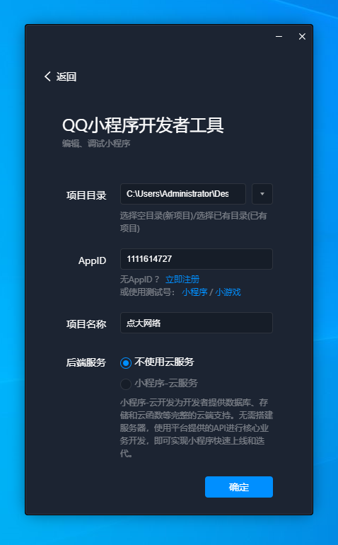 2、选择项目目录为下载并解压后的小程序代码包目录点击确定