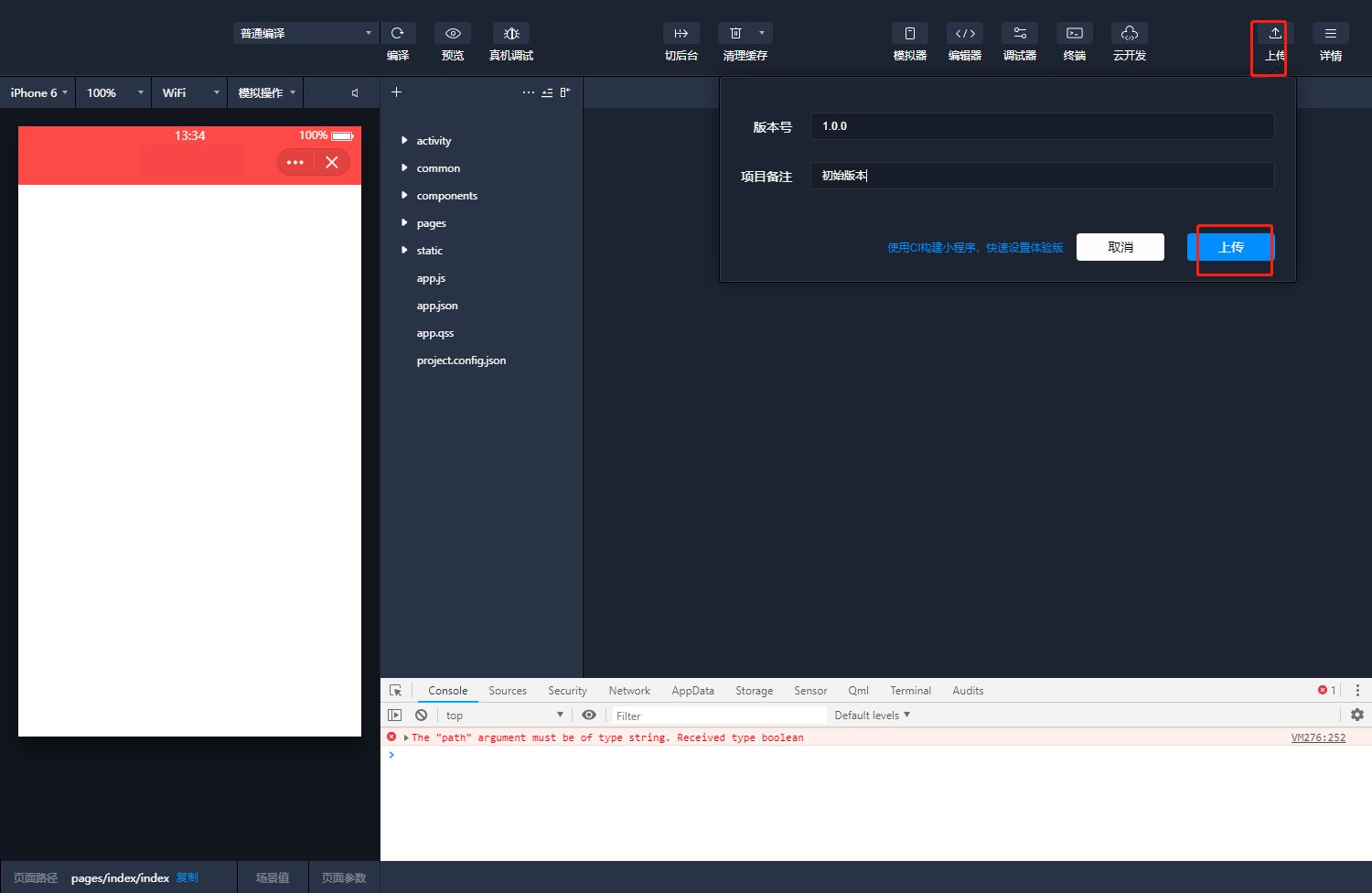 点击导入的项目等待开发者工具加载完成后点击上传