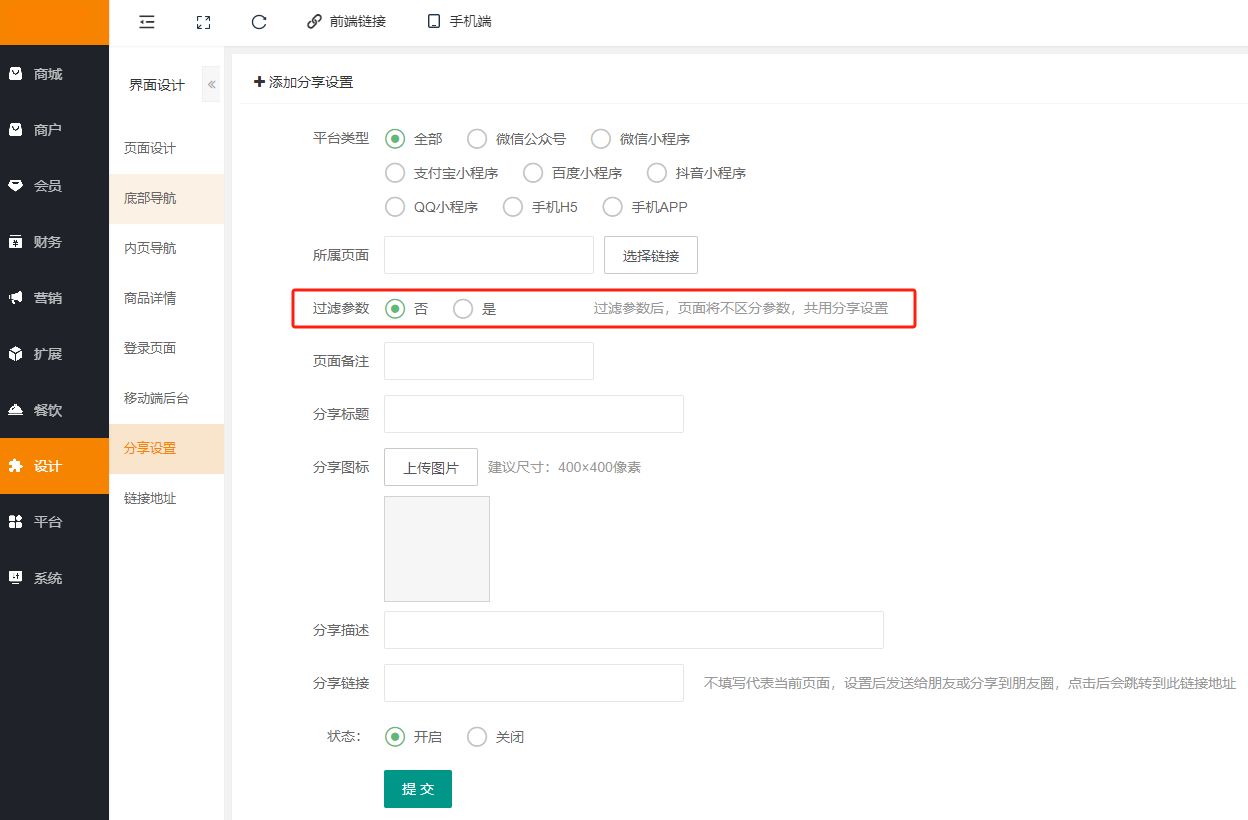 注意:添加分享设置里的过滤参数需要谨慎设置,过滤参数后,页面将不区分参数,共用分享设置,例如分享此页面绑定不了推荐关系