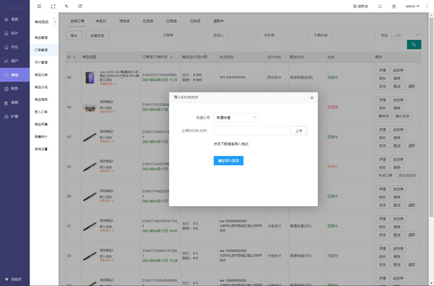 用于查看订单、导出订单、筛选订单、批量发货、修改订单,删除订单等操作。